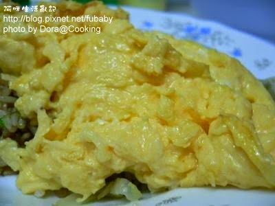 4.趁蛋8分熟時,就可以鏟到炒飯上喔!!!
