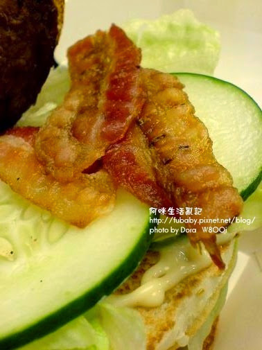 有點焦黃的培根,還有爽脆的大黃瓜片,跟淋上美奶滋的生菜....