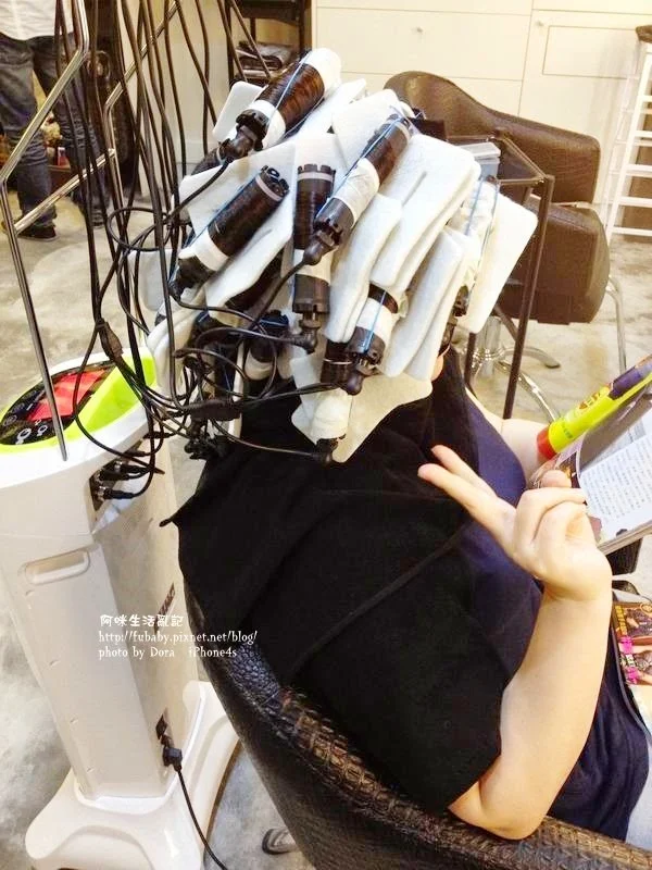 在上捲子前,阿哲先幫我護髮,接著才上捲子、加熱,