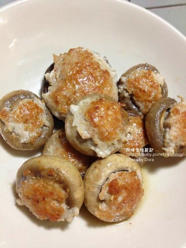 4. 之後把肉塗在菇菇上,稍微整一下型,弄成圓圓的就好。
