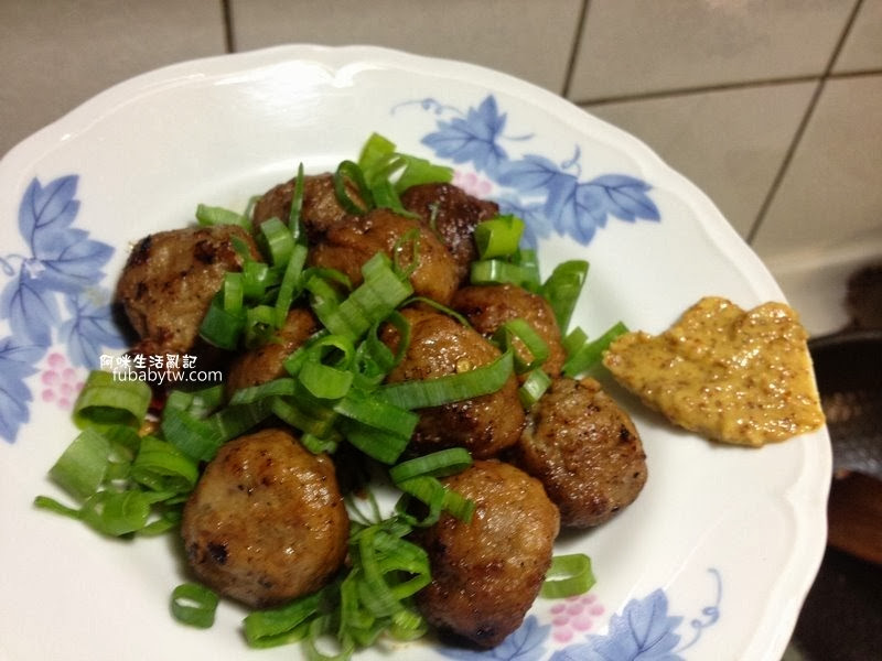最後就是IKEA的肉丸子,先丟去微波、然後放入沒加油的熱鍋內乾煎,最後灑上點蔥花、放上一匙芥末醬,