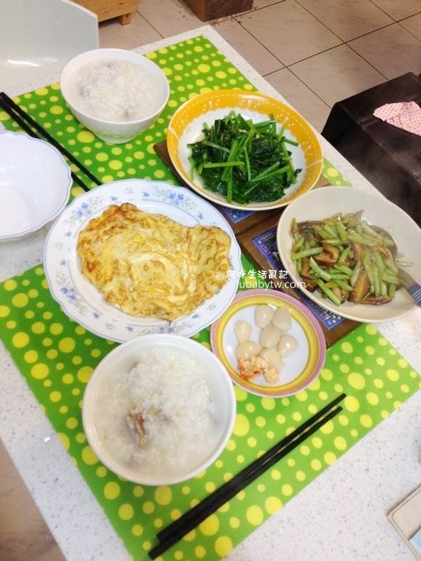 餐點:豬骨粥、醬油蛋、炒菠菜、香菇四季豆