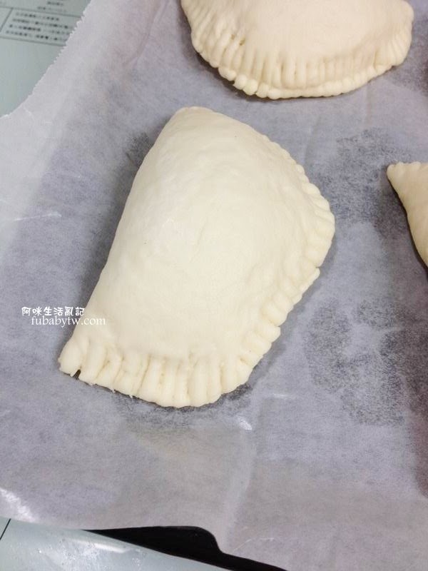最後把麵皮對折,用叉子沿著邊緣壓出痕跡、封口完成,開始第二次發酵。